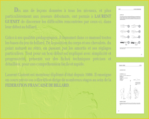 Douze années de leçons données à tous les niveaux, et particulièrement aux joueurs débutants ou faux débutants, ont permis à Laurent GUENET de discerner les difficultés rencontrées par ceux-ci, dans leur début au billard.
